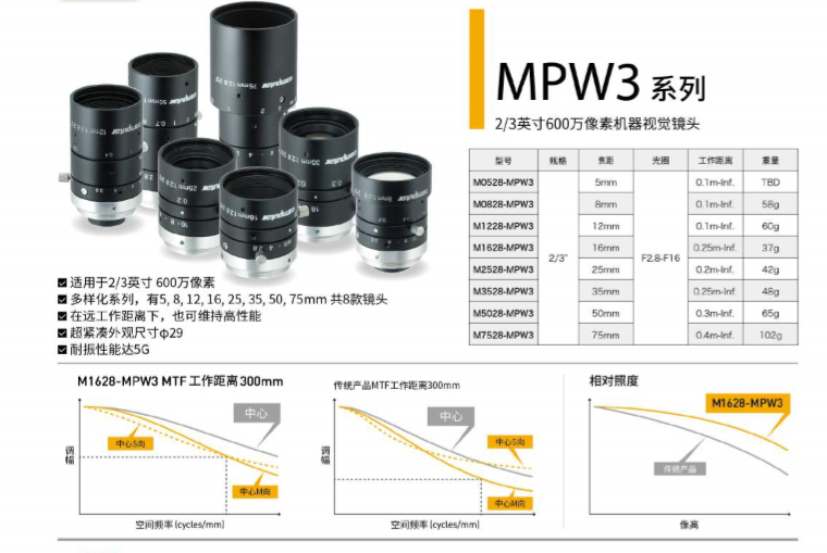 日本CBC旗下Computar鏡頭發(fā)布新款MPW3系列機器視覺鏡頭,該鏡頭最大支持2/3英寸靶面同時具有600萬像素,共有8款型號選擇(5mm、8mm、12mm、16mm、25mm、35mm、50mm、75mm),在外觀及功能上具有緊湊型&輕量化、低畸變、超短工作距離、視場亮度均勻等特征,匹配在IMX250、IMX264、IMX178、RJ3254、S3AA0DK、ICX625、EV2505M等芯片上,適用范圍:機器視覺、工業(yè)自動化,智能交通,道路監(jiān)控等。