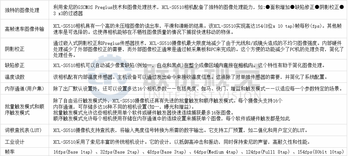 ●該XCL-SG510(黑白)結(jié)合了索尼技術(shù)的最佳在一個方便的形式因素,這是優(yōu)化的工業(yè)視覺和非制造的視覺市場使用。