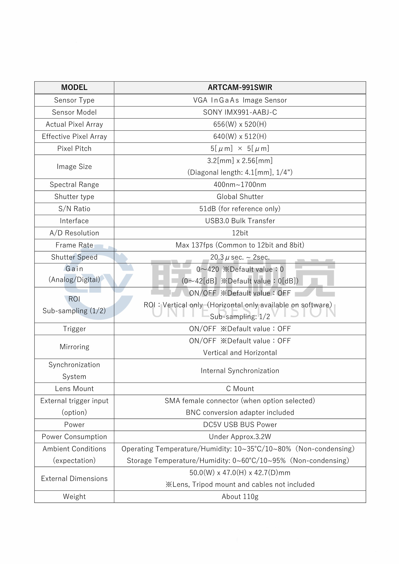 ARTRAY 400-1700nm寬波段近紅外相機(jī)--ARTCAM-991SWIR