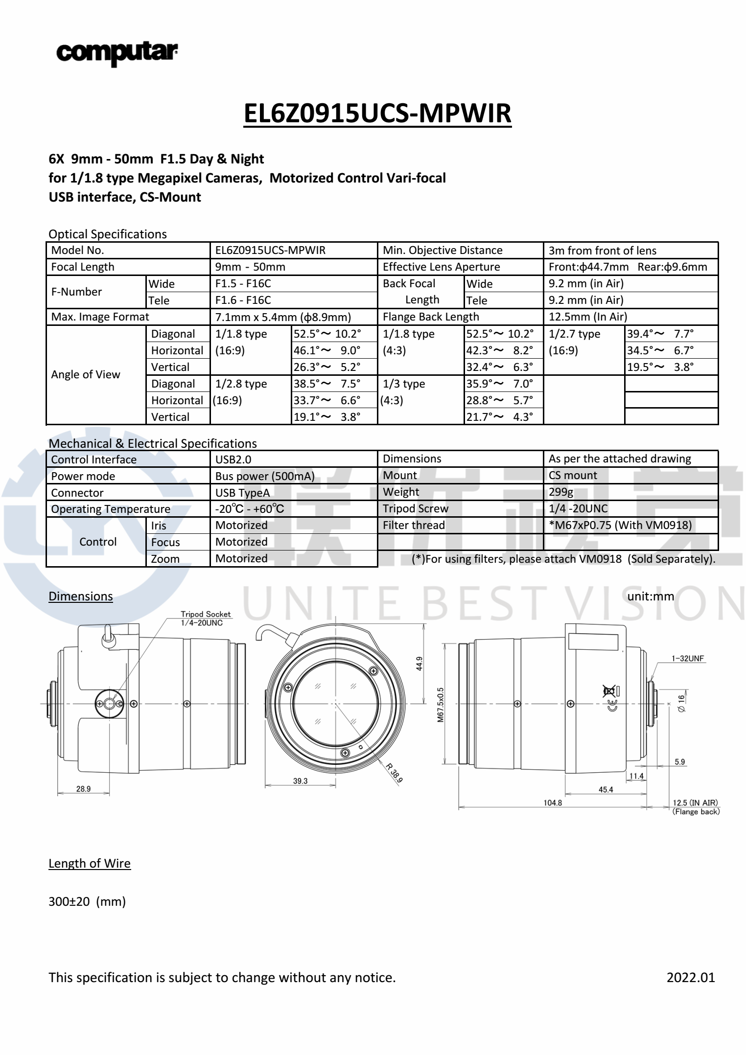 • 全新電動鏡頭,可通過 USB 供電和控制(適用于 I2C 版本)